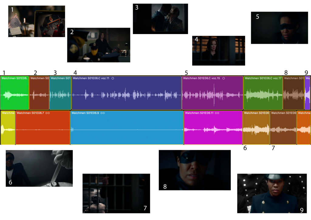 1.Música de pelea extradiegética que se aplica mientras el justiciero golpea a los agentes. Después pasa a ser diegética cuando se descubre, tras el zoom out, que es una serie, la cual están viendo en la comisaría y que perciben, auditivamente, los policías (música desauricularizada→pasa a auricularizada).