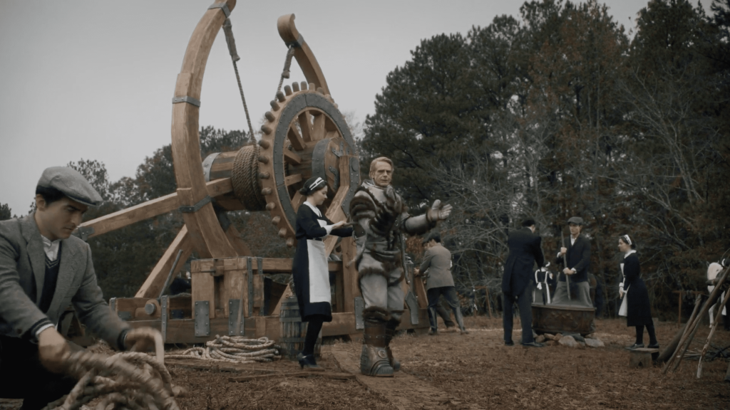 Para este análisis en concreto, vamos a utilizar un fragmento del capítulo 5 que inicia en el 47’50» y termina en el 49’20». En esta escena podemos ver a Adrian Veidt, un megalómano y sociópata, en la preparación de uno de sus experimentos para mandar a una persona con una catapulta directa a la luna. En esta ocasión y tras varios intentos, va a ser él quien va a ser lanzado. El experimento resulta un éxito al conseguir que Adrian llegue y pise la luna, donde contempla en su alrededor todos los cuerpos muertos de los intentos fallidos.